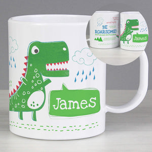 Personalise this 'Be Roarsome' Dinosaur Plastic Mug with any first name up to 12 characters.