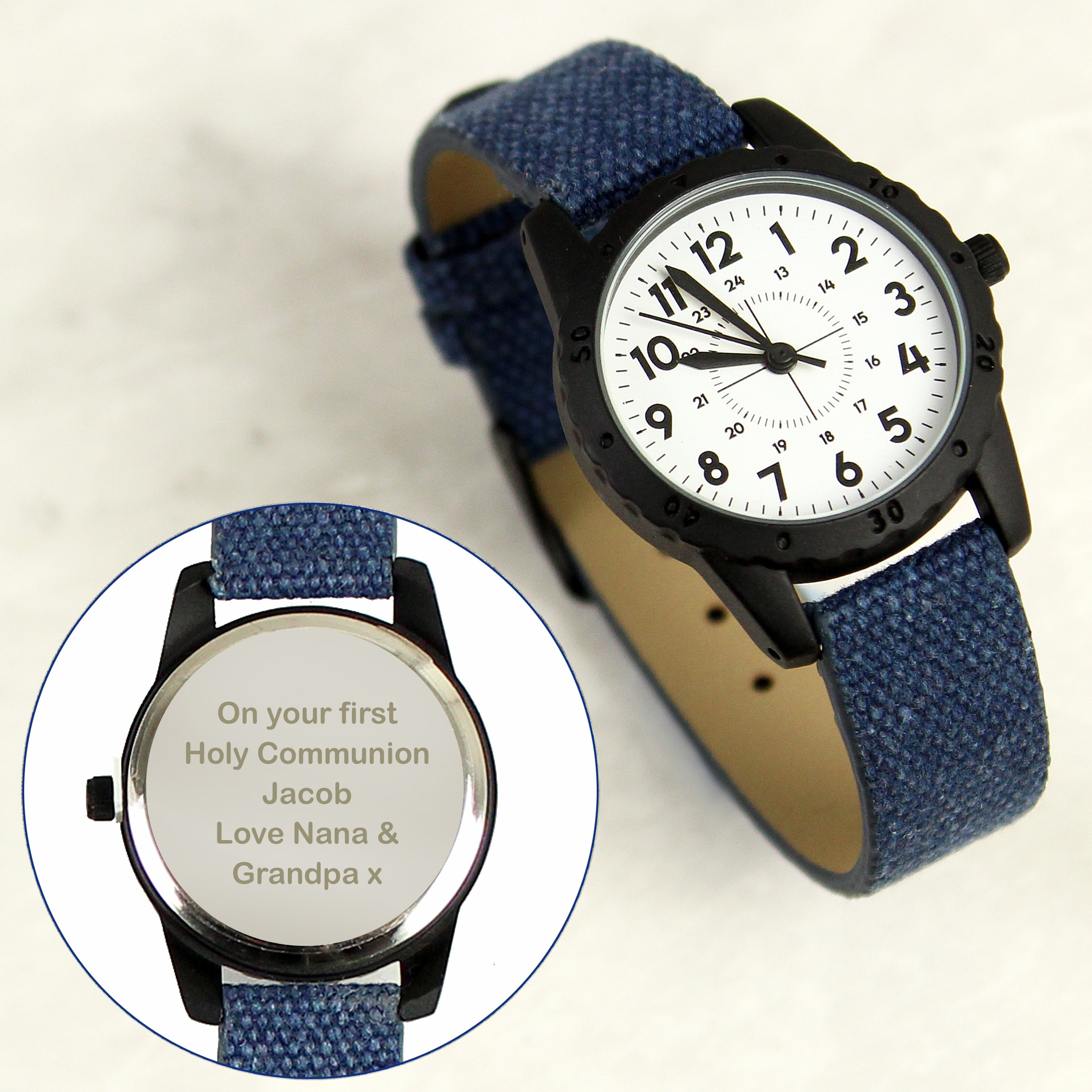 This Personalised Black with Blue Canvas Strap Boys Watch is the perfect gift for any young man on any occasion!
