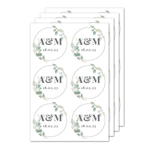 Personalise this set of 24 Botanical Initial Wedding Stickers with 2 lines of text as below