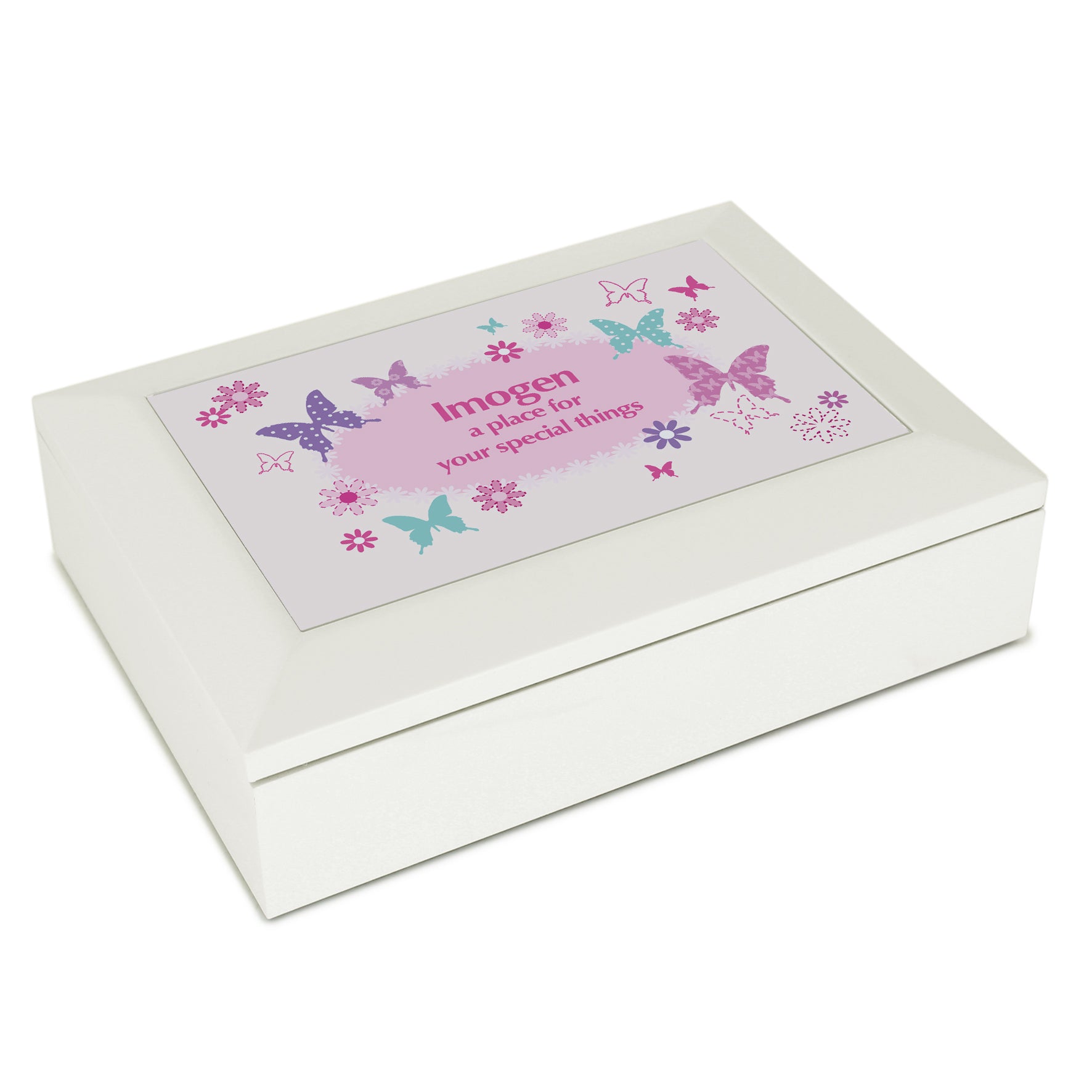 Personalise this Butterfly White Jewellery Box with a name up to 12 characters and up to 2 lines of 20 characters each for a message.
