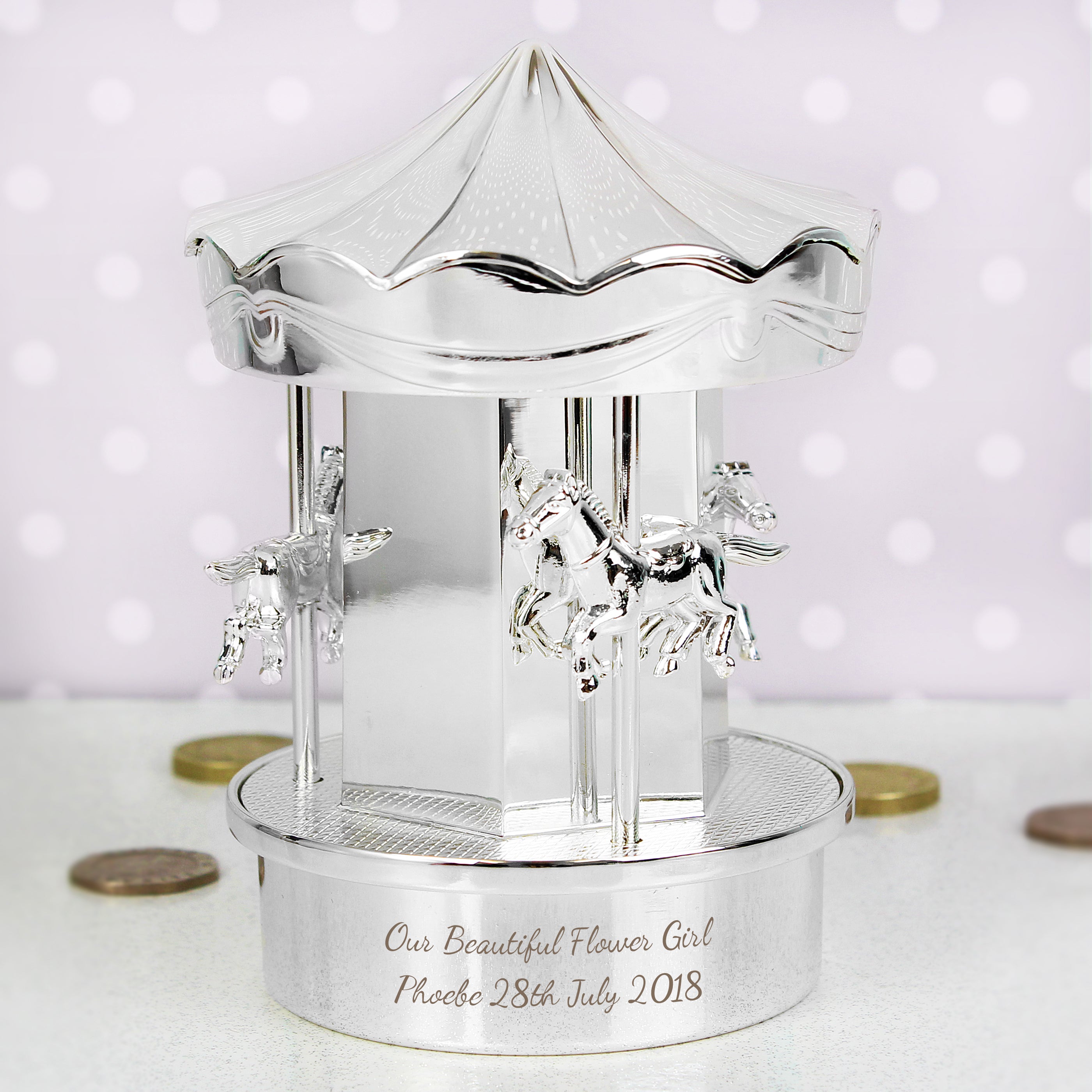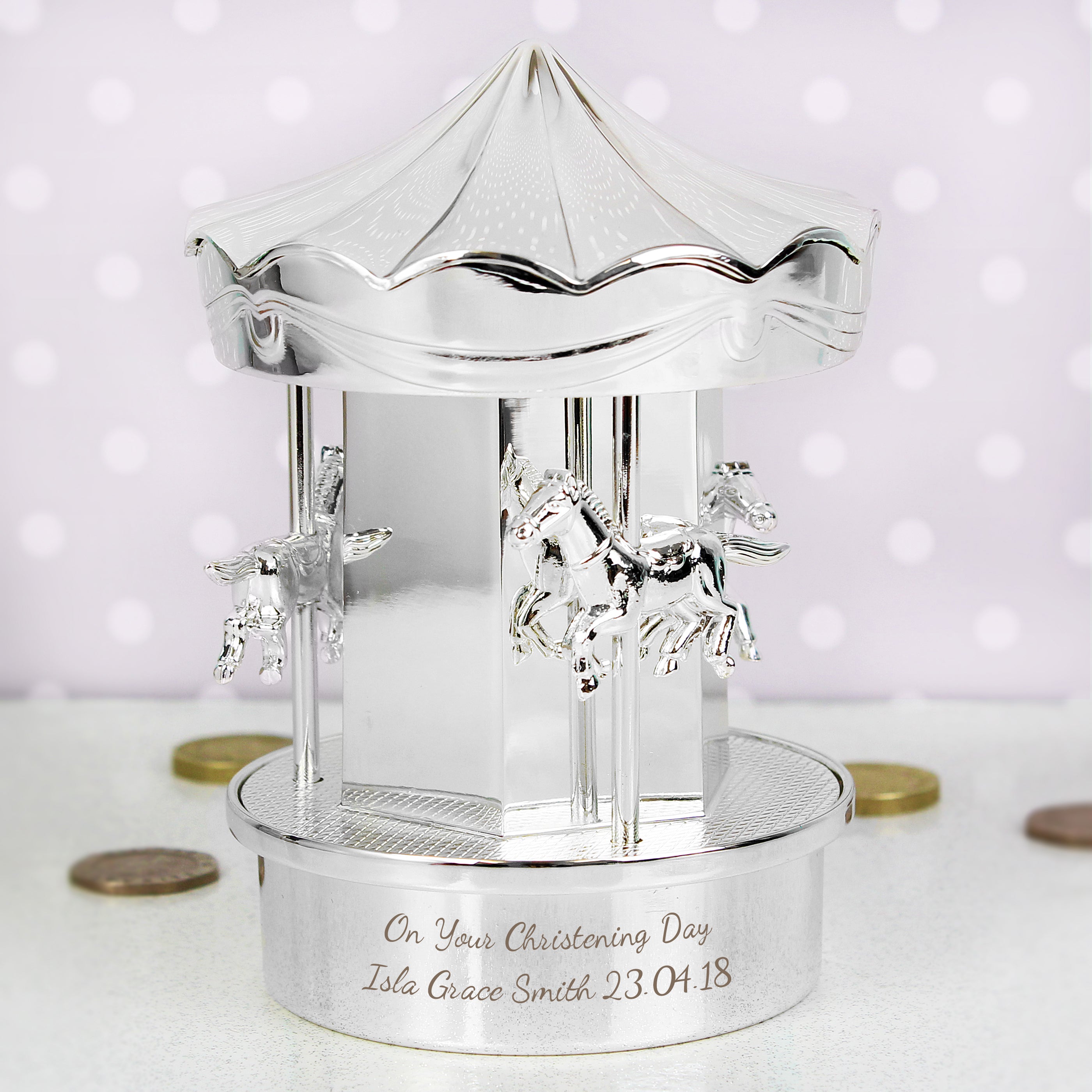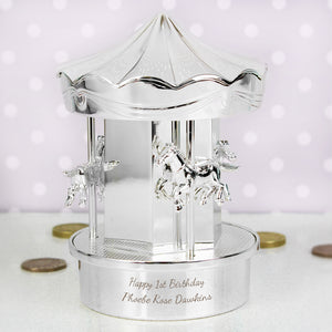 Personalise this silver plated Carousel Money Box with any message around the base over 2 lines and up to 30 characters per line