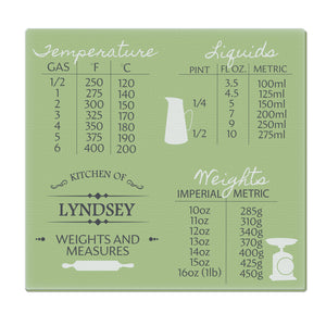 You can personalise this glass chopping board with a line of text up to 20 characters in length (e.g. the family name). The words 'KITCHEN OF' and 'WEIGHTS AND MEASURES' are fixed. All personalisation will appear in UPPERCASE.