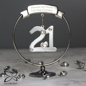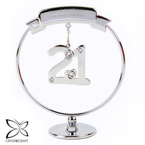 Mark their 21st Birthday with this elegant Crystocraft ornament. Dangling from a personalised round silver stand, is a crystal clad 21. This will catch the light and bring a smile to the recipients face.