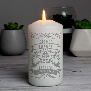 This Grey Paper Cut Pillar Candle is a gorgeous commemorative gift perfect for any religious occasion!