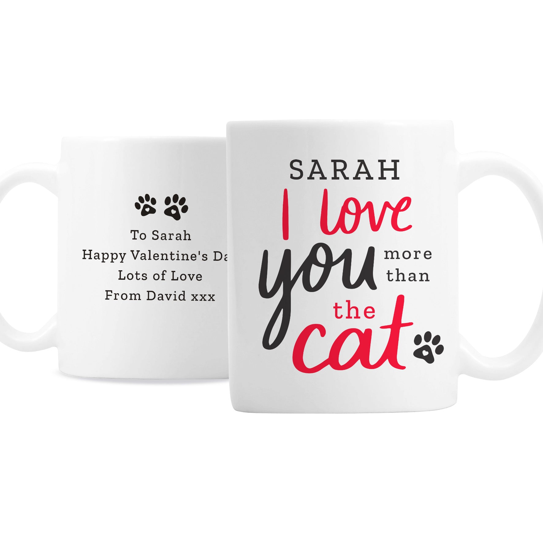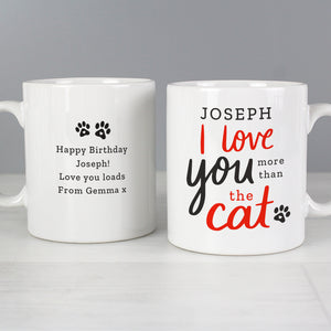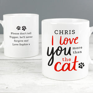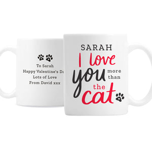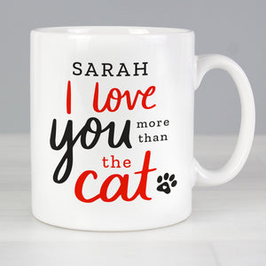 This cute personalised mug features the text "I love you more than the cat" to the front, high praise for a partner who knows how much you love your feline friend!