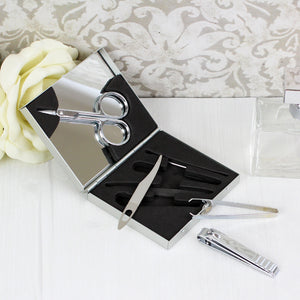 Our Manicure set features a clasp opening with 5 precision implements presented neatly in a foam divider. This also comes with a mirror conveniently inside the lid of the box.