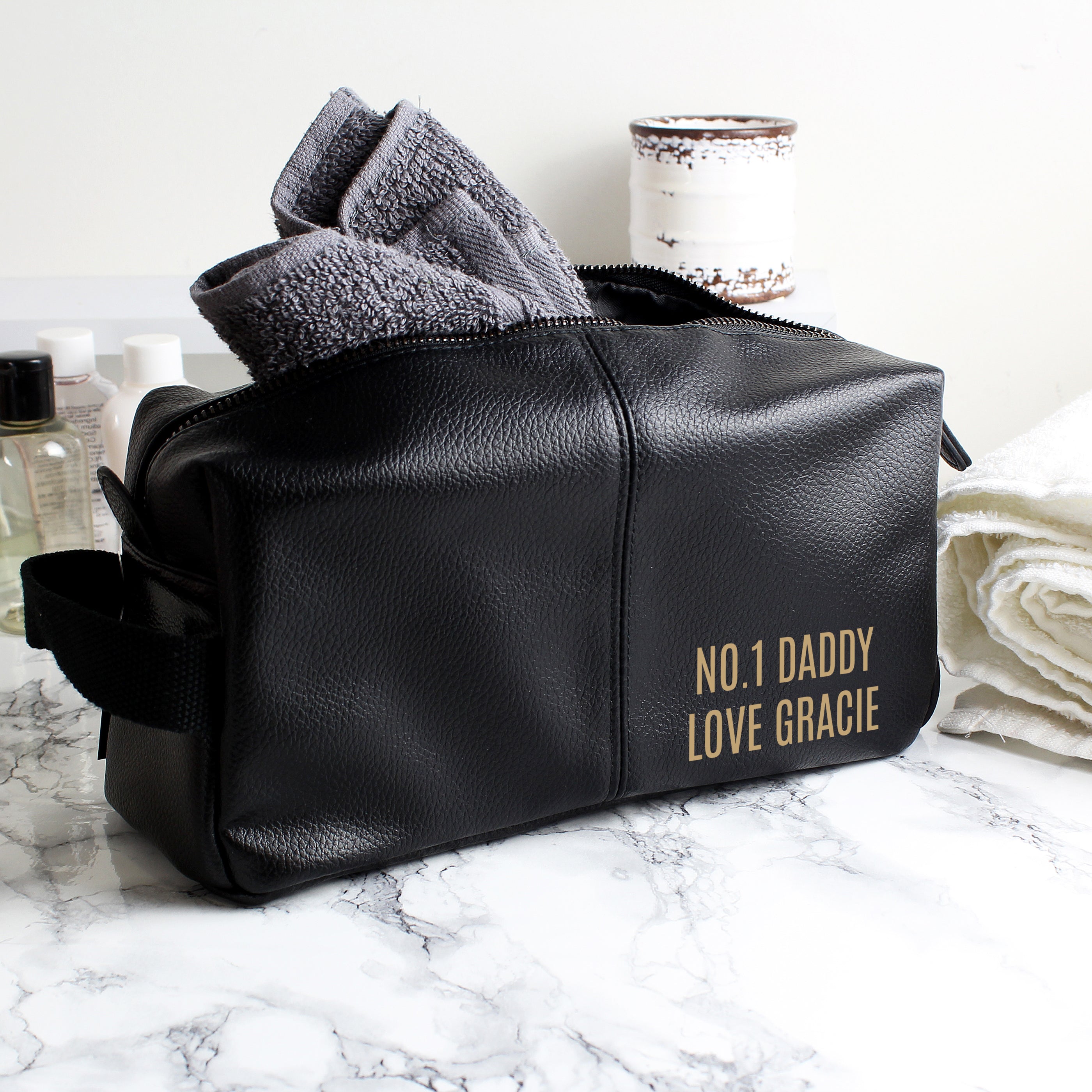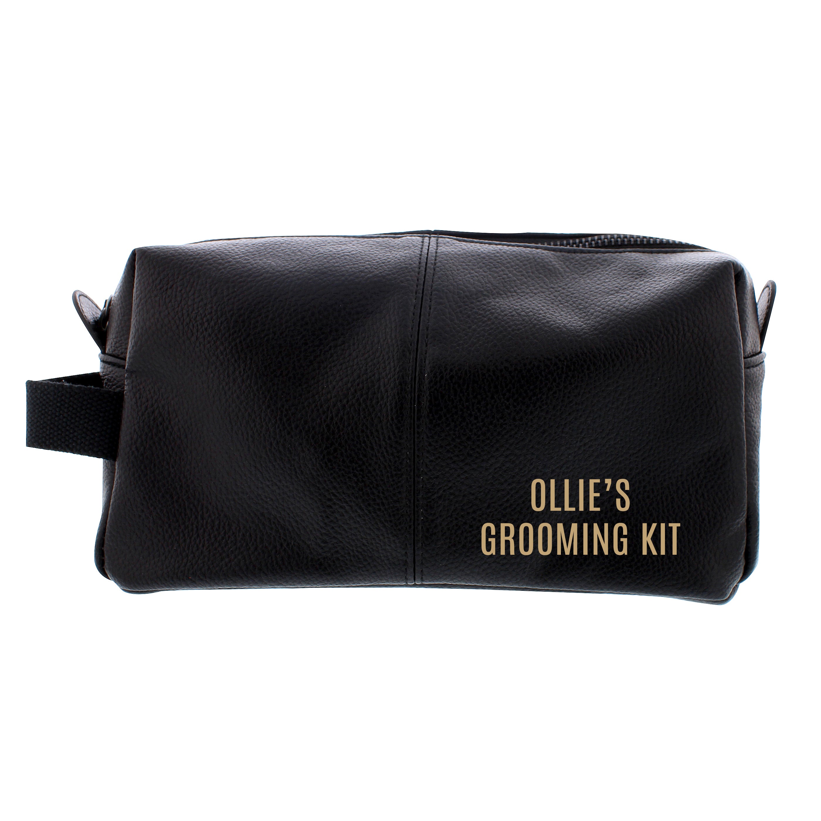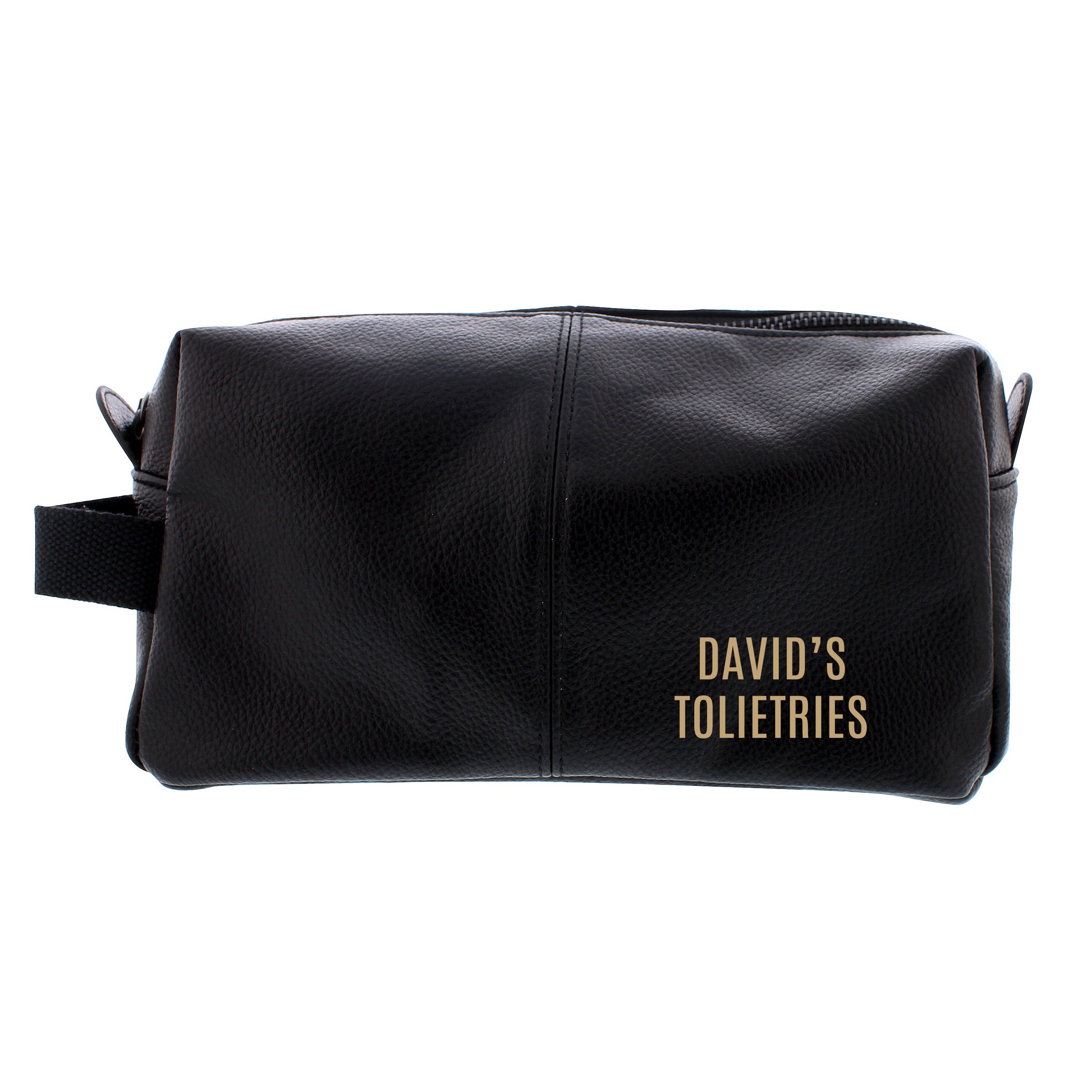 Personalise this black leatherette washbag with up to 2 lines, there is 12 characters available per line.