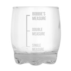 Personalise this whisky glass with any name up to 12 characters in length. The words 'MEASURE', 'DOUBLE MEASURE', and 'SINGLE MEASURE' are fixed.