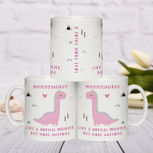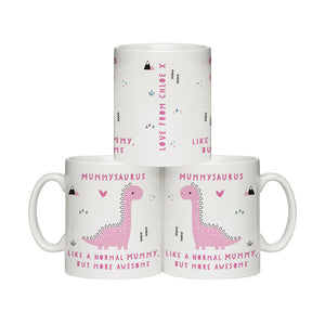The title will appear at the top of the mug before the fixed text 'saurus' and again at the bottom in fixed text 'Like a normal {title} but more awesome'.