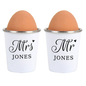 You can personalise these egg cups with a surname up to 10 characters long. The name will appear the same on both.