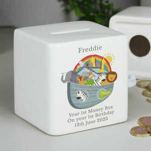 Keep those pennies safe and secure with our adorable Personalised Noah's Ark Square Money Box