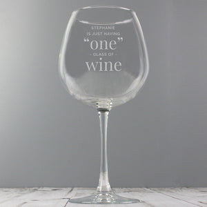 Personalisation will appear in UPPERCASE. The text 'IS JUST HAVING "one" GLASS OF wine' is fixed and cannot be amended.