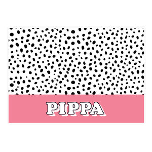 Personalise this pink spot food and water pet placemat with a pets name using up to 12 characters.