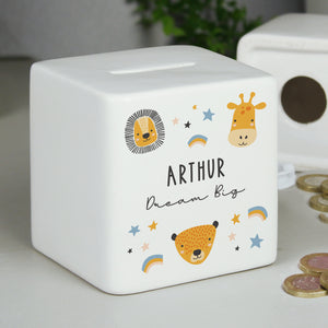 Personalised Scandi Safari Animals Ceramic Square Money Box