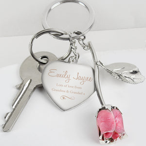 Personalised Silver Plated Swirls & Hearts Pink Rose Keyring