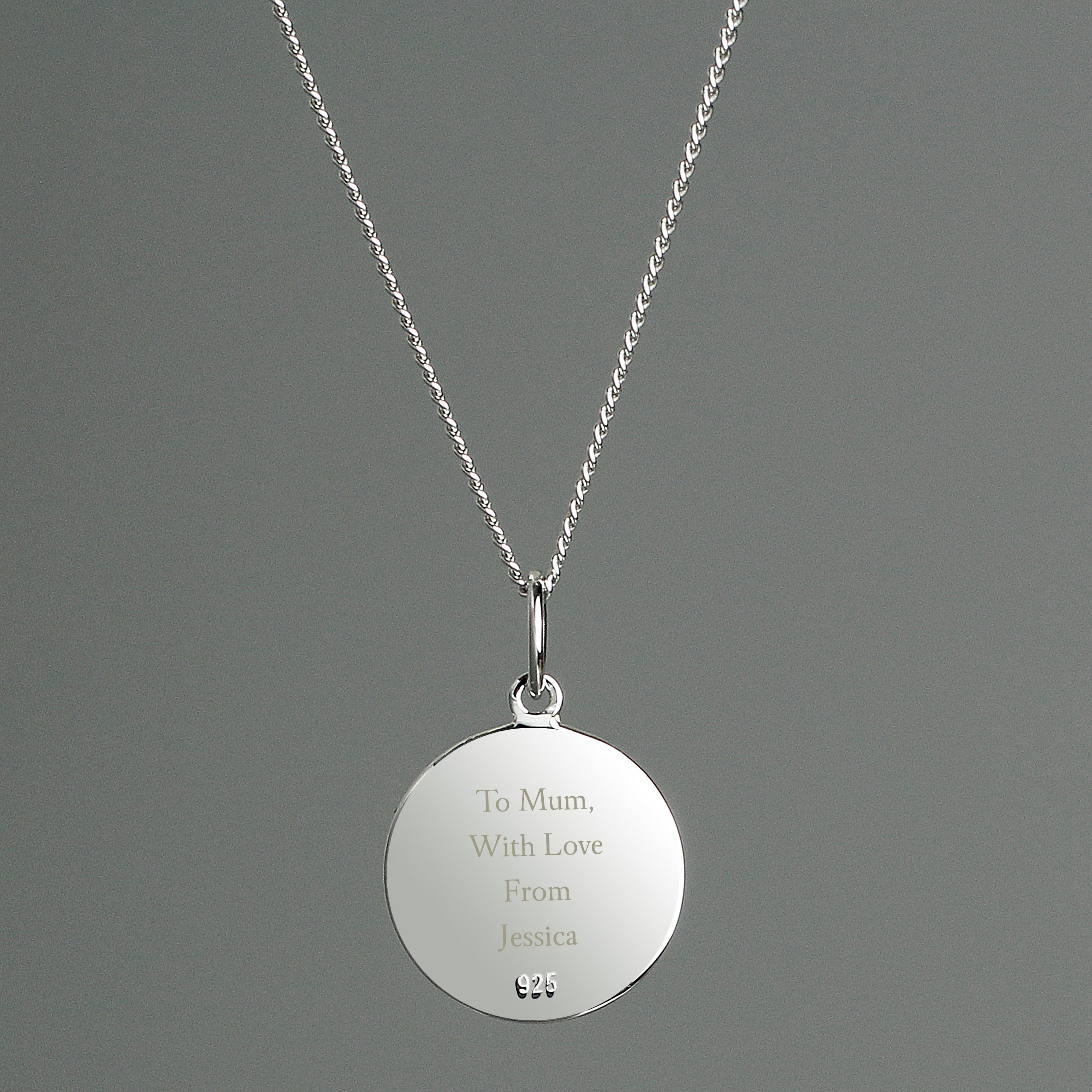 The necklace can be personalised with 4 lines of text. Lines 1 and 4 can be personalised with up to 10 characters each. Lines 2 and 3 can be personalised with 12 characters each.