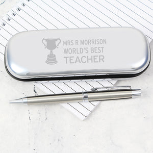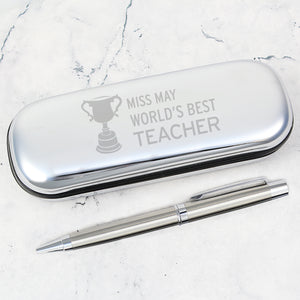 This chrome plated pen and box set includes a ball point pen, the box features a trophy motif with the words 'Worlds Best Teacher' as standard and can be engraved with your favourite teachers name up to 20 characters.
