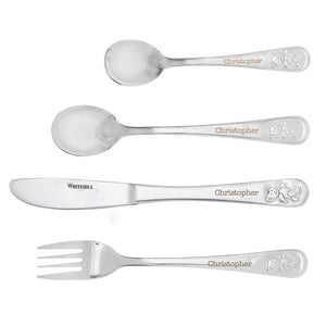This stylish 4 piece set of steel cutlery featuring a cute teddy design can be personalised with any name up to 15 characters.