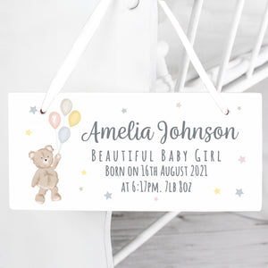 This fabulous personalised Teddy & Balloons Hanging Wooden Sign will look great on a bedroom door, or proudly displayed around the home.