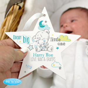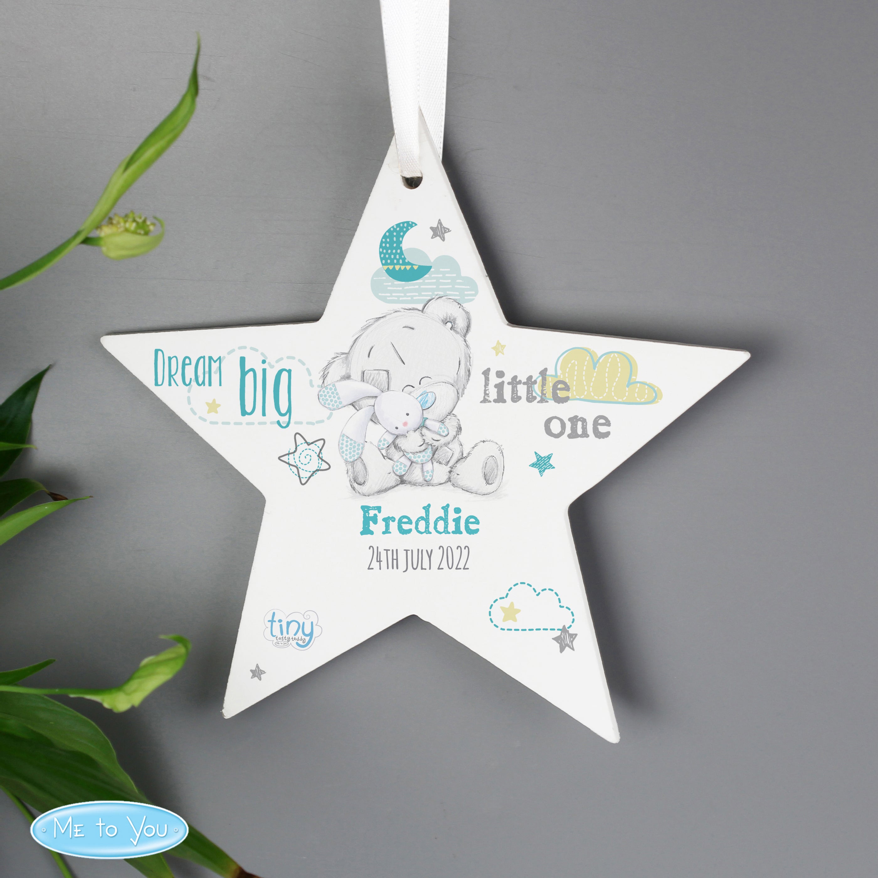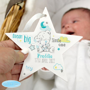 Our Personalised Tiny Tatty Teddy Blue Dream Big Wooden Star Decoration can be used as a stylish hanging decoration, or as a unique and thoughtful gift tag.