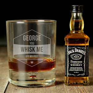 Personalise this whisky themed gift set with a name of up to 12 characters above the fixed quote 'You whisk me off my feet'.