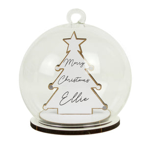 This Personalised Christmas Tree Glass Bauble adds a personal touch to the Christmas tree. This bauble is made from glass with a wooden base and shape inside of the bauble.