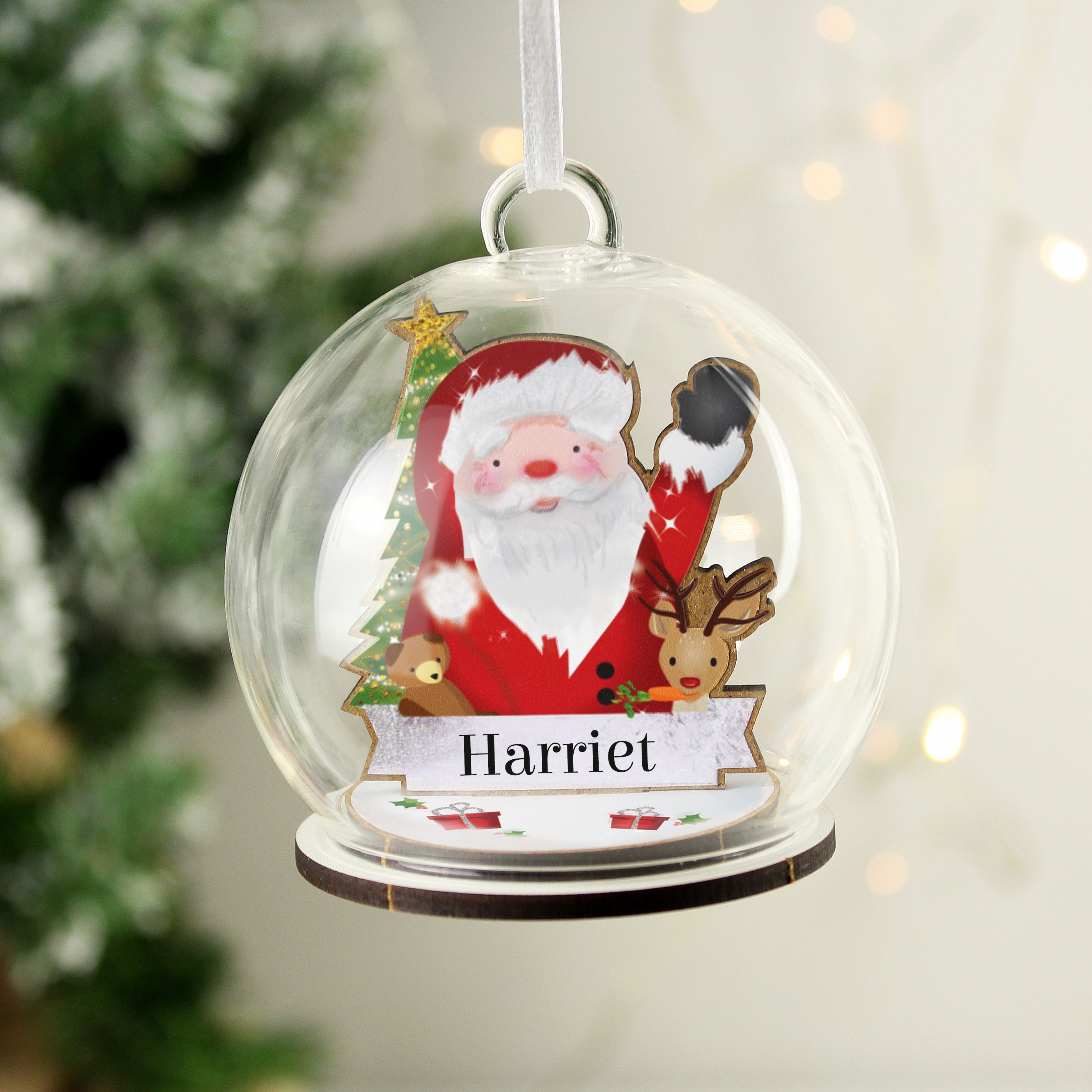 This Personalised Santa Glass Bauble adds a personal touch to the Christmas tree. This bauble is made from glass with a wooden base and shape inside of the bauble.